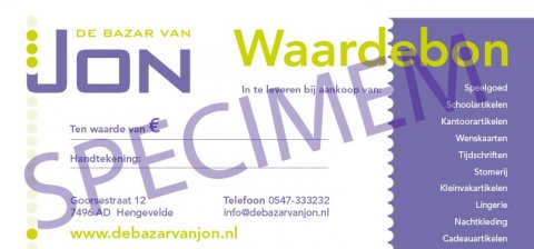 De Bon van Jon is bedoeld voor bijvoorbeeld kinderfeestjes, kraamcadeaus of verjaardagen. Bedragen vanaf € 5.00 t/m elk gewenst bedrag en onbeperkt geldig!